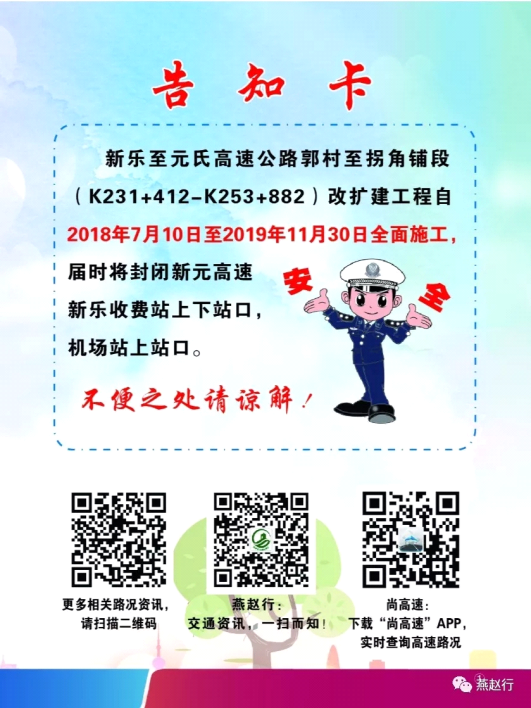 长城网7月5日讯(记者 于仕越 通讯员 成珊珊 王炜彬)记者从石家庄机场获悉,自今年7月10日至2019年11月30日,新元高速正定拐角铺至新乐郭村段改扩建施工,历时一年四个多月。届时,将封闭新元高速新乐收费站上下站口,石家庄机场上站口。