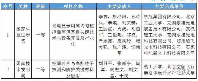 从河北省科技厅获悉,河北省共有15项通用项目获奖,其中,“光电显示用高均匀超净面玻璃基板关键技术与设备开发及产业化”项目获国家科技进步奖一等奖,这也是由河北省主持研发的通用项目首获该奖项。此外,河北省另有1项参与研发项目获国家科技进步奖一等奖,并摘得9项国家科技进步奖二等奖、1项国家自然科学奖二等奖、3项国家技术发明二等奖。