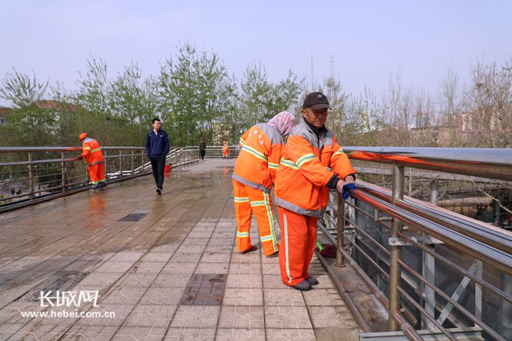 在东二环一处人行过街天桥上,环卫工人正在进行栏杆清洁工作。记者 王亚 摄