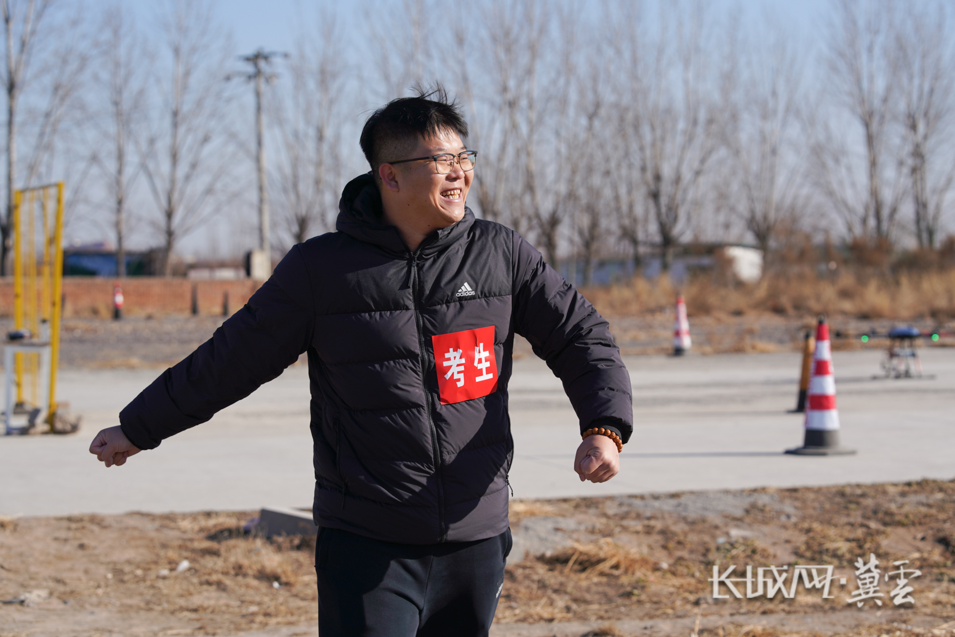 来自河北电力系统的张学迪兴奋地挥舞双手、满脸喜悦地走出实践考场。他报考的是无人机驾驶员执照,不需要参加后续科目考试,顺利通过实践考试意味着他已经拿到了执照。(机长和教员执照需要继续参加后续科目考试)